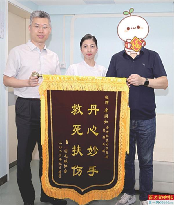 南科大医院副院长王林、护士李丽如和李先生(右一)合影。 受访者供图