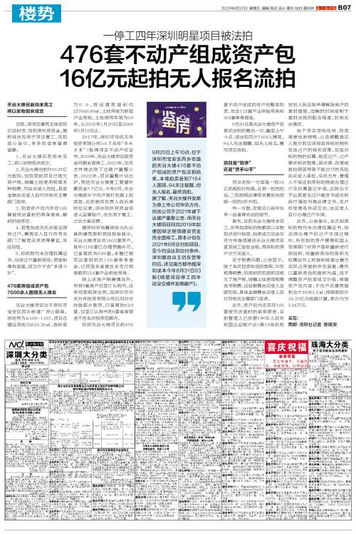 9月20日上午10点,位于深圳市宝安区西乡街道的天谷大楼476套不动产组成的资产包法拍结束。本场拍卖受到7164人围观、94关注提醒,但无人报名,最终流拍。 据了解,天谷大楼开发商为原上市公司华