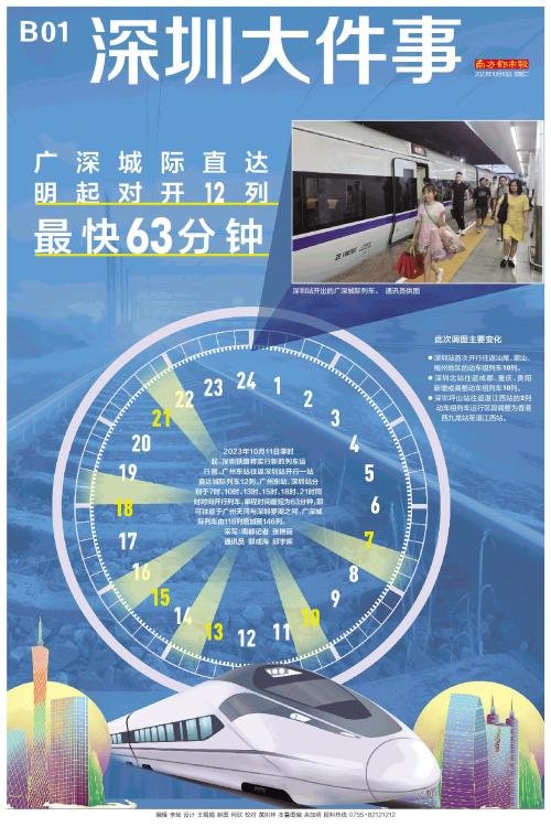 2023年10月11日零时起,深圳铁路将实行新的列车运行图。广州东站往返深圳站开行一站直达城际列车12列。广州东站、深圳站分别于7时、10时、13时、15时、18时、21时同时对向开行列车,单程时