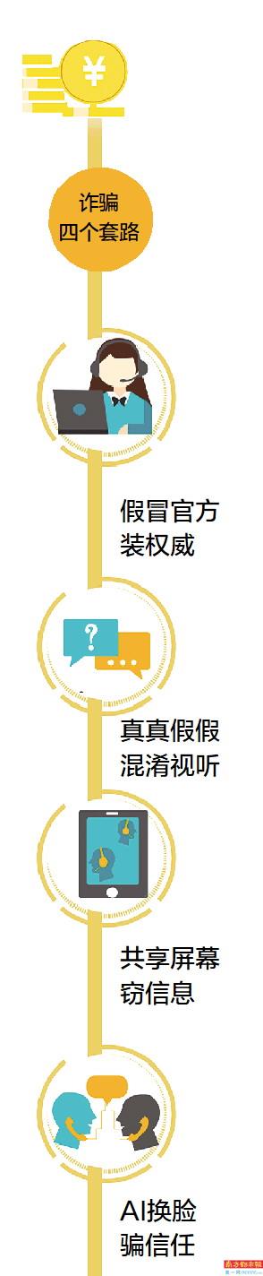 四是AI换脸骗信任。诈骗分子在非法获取消费者个人信息后,甚至可以运用智能换脸和拟声技术,佯装亲人、好友、领导打电话或开启视频聊天。在“面对面聊天”成功骗取信任后,便以“借钱”“走账”等各种理由要求消费者向其指定账户转账。