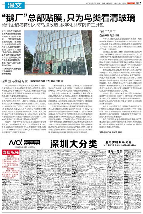 “鹅厂”总部贴膜,只为鸟类看清玻璃