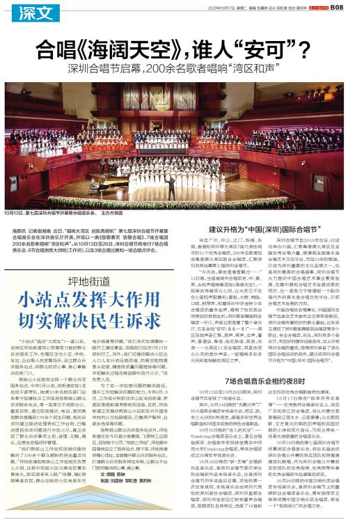南都讯 记者谢湘南 近日,“唱响大湾区 启航再扬帆” 第七届深圳合唱节开幕暨合唱音乐会在深圳音乐厅开演。开场以一曲《致敬春天 致敬合唱》,7城合唱团200余名歌者唱响“湾区和声”。从10月13日至