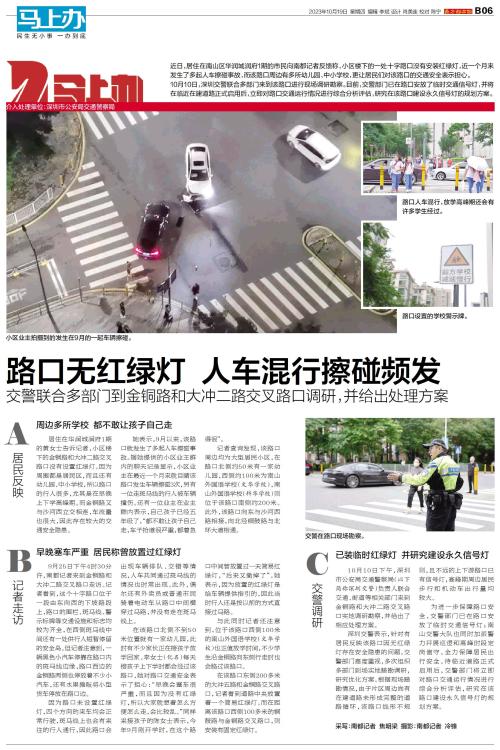 介入处理单位:深圳市公安局交通警察局 近日,居住在南山区华润城润府1期的市民向南都记者反馈称,小区楼下的一处十字路口没有安装红绿灯,近一个月来发生了多起人车擦碰事故,而该路口周边有多所幼儿园、中