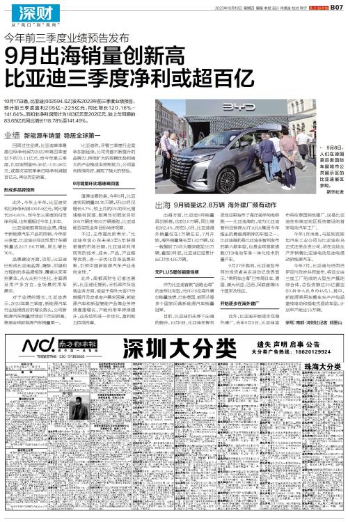 9月出海销量创新高 比亚迪三季度净利或超百亿