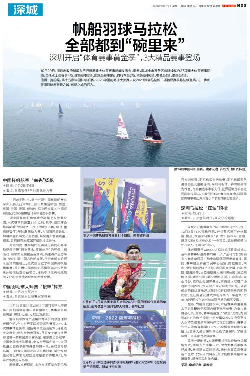 10月20日,深圳市政府新闻办召开近期重大体育赛事新闻发布会。据悉,深圳全市及各区将陆续举办27项重大体育赛事活动,包括水上类赛事4项、球类赛事5项、路跑类赛事8项、自行车类2项、棋类赛事6项、电