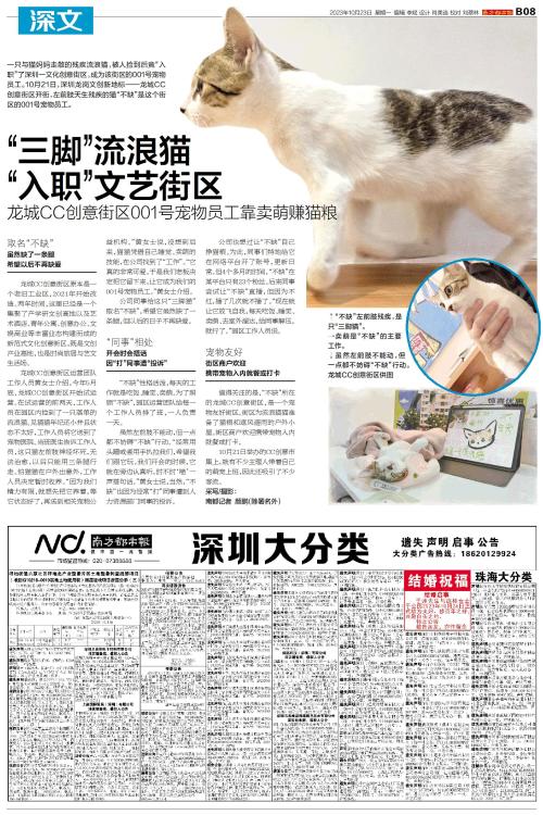 一只与猫妈妈走散的残疾流浪猫,被人捡到后竟“入职”了深圳一文化创意街区,成为该街区的001号宠物员工。10月21日,深圳龙岗文创新地标——龙城CC创意街区开街,左前肢天生残疾的猫“不缺”是这个街区