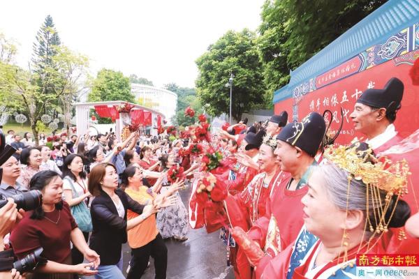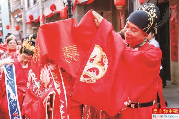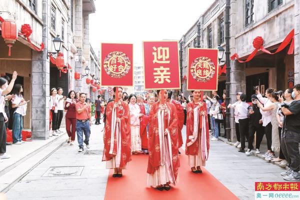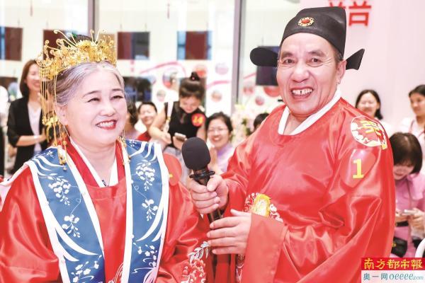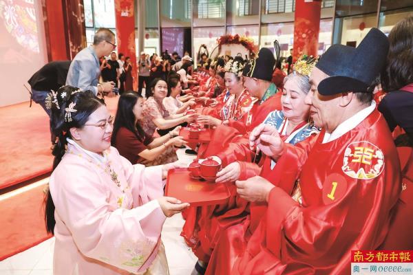 10月19日,观澜古墟,19对金婚“新人”沉浸式体验传统中式婚俗的出阁礼、梳妆礼、交杯酒、鸣喜炮、上花轿、入喜堂等一系列环节,并在现场分享他们携手共度50载的爱情婚姻故事。