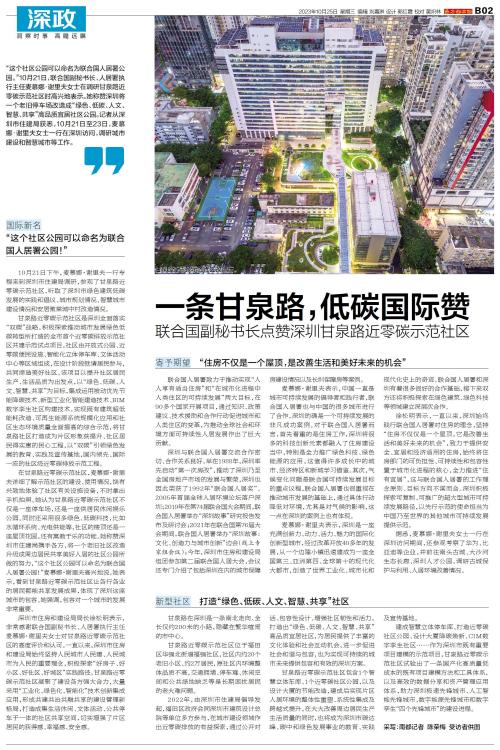 “这个社区公园可以命名为联合国人居署公园。”10月21日,联合国副秘书长、人居署执行主任麦慕娜·谢里夫女士在调研甘泉路近零碳示范社区时高兴地表示。她称赞深圳将一个老旧停车场改造成“绿色、低碳、人文