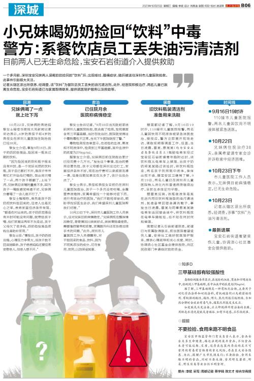一个多月前,深圳宝安兄妹两人误喝奶奶捡回的“饮料”后,出现呕吐、腹痛症状,随后被送往深圳市儿童医院抢救。此事件引起极大关注。 记者从辖区派出所获悉,经调查,该“饮料”为餐饮店员工丢失的油污清洁剂