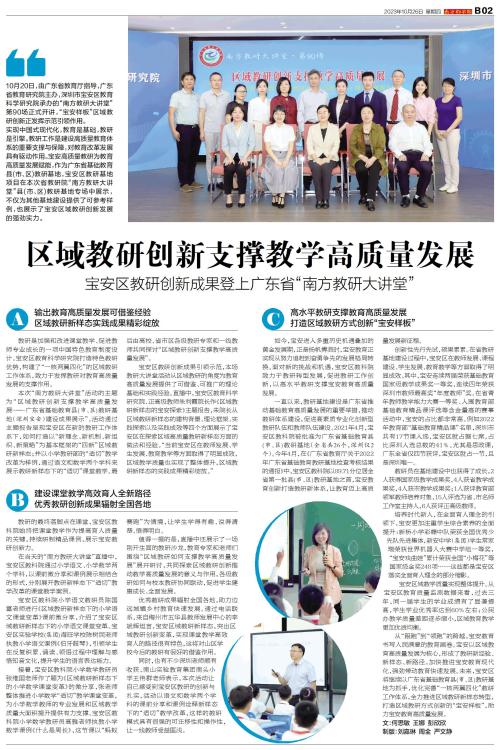 10月20日,由广东省教育厅指导,广东省教育研究院主办,深圳市宝安区教育科学研究院承办的“南方教研大讲堂”第90场正式开讲,“宝安样板”区域教研创新正发挥示范引领作用。 实现中国式现代化,教育是