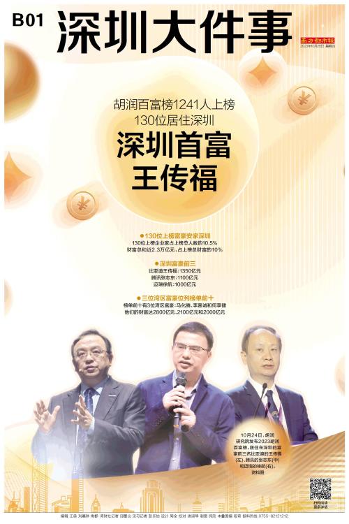 130位上榜富豪安家深圳 130位上榜企业家占上榜总人数的10.5% 财富总和近2.3万亿元,占上榜总财富的10% 深圳富豪前三 比亚迪王传福:1350亿元 腾讯张志东:1100亿元