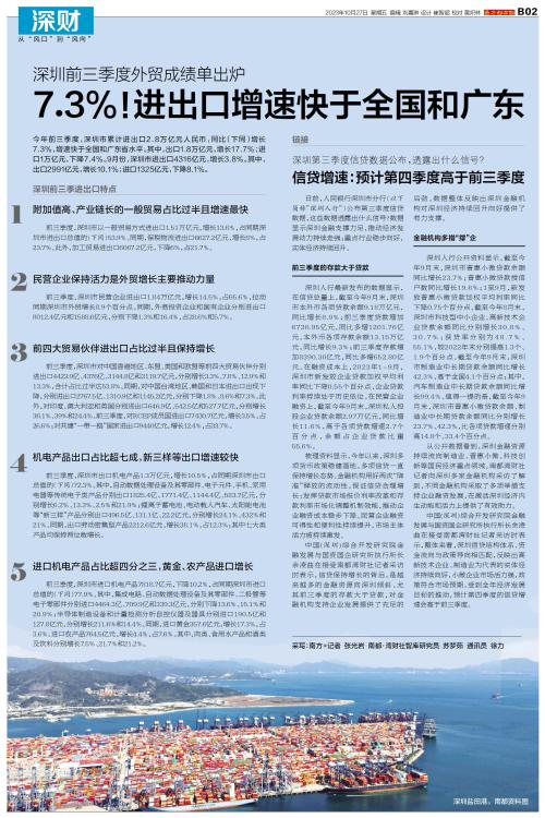 今年前三季度,深圳市累计进出口2.8万亿元人民币,同比(下同)增长7.3%,增速快于全国和广东省水平。其中,出口1.8万亿元,增长17.7%;进口1万亿元,下降7.4%。9月份,深圳市进出口431