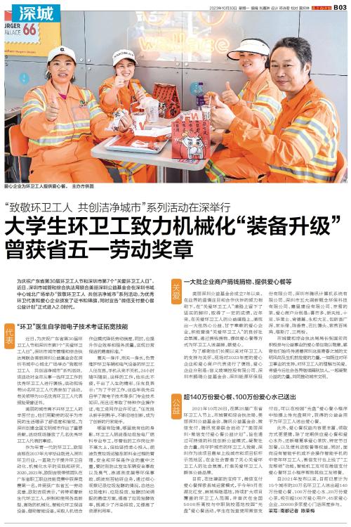 为庆祝广东省第30届环卫工人节和深圳市第7个“关爱环卫工人日”,近日,深圳市城管和综合执法局联合美丽深圳公益基金会在深圳书城中心城北广场举办“致敬环卫工人 共创洁净城市”系列活动,为优秀环卫代表和