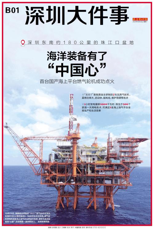 ◎“太行7”是我国自主研制的7兆瓦燃气轮机,具有功率大、启动快、能耗低、维护简便等优点 ◎1小时发电量超5000千瓦时,相当于500个家庭一天用电需求,可满足1座海上油气平台全部生产和生活需