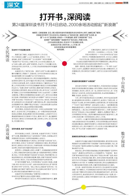 南都讯 记者谢湘南 近日,第24届深圳读书月新闻发布会在市民中心举行。南都记者了解到,本届读书月将于11月4日在中心书城启动,以“阅历史文脉 读现代文明”为主题,设置“1+4+N”活动框架,即举办