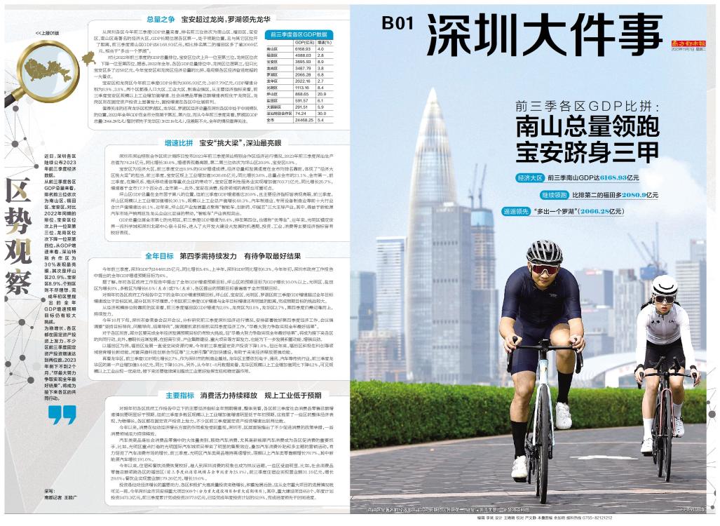 经济大区 前三季南山GDP达6168.93亿元 继续领跑 比排第二的福田多2080.9亿元 遥遥领先 “多出一个罗湖”(2066.28亿元) 近日,深圳各区陆续公布2023年前三季度经