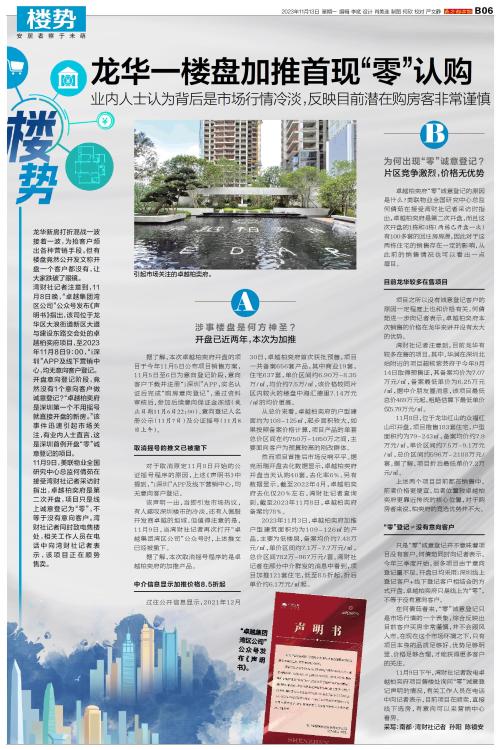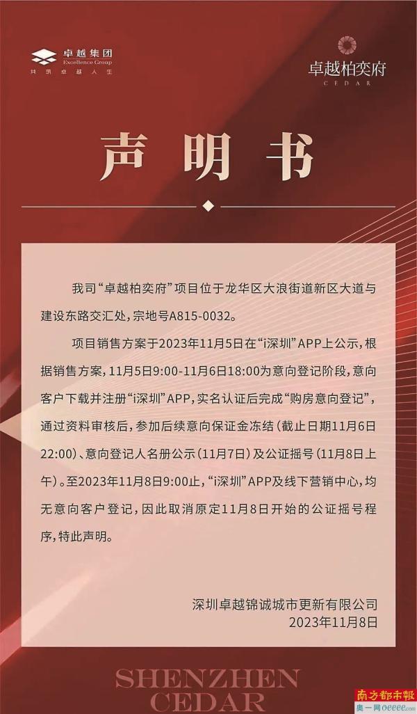 湾财社记者注意到,11月8日晚,“卓越集团湾区公司”公众号发布《声明书》指出,该司位于龙华区大浪街道新区大道与建设东路交会处的卓越柏奕府项目,至2023年11月8日9:00,“i深圳”APP及线下营销中心,均无意向客户登记。