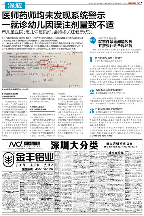 近日,有网友爆料称,深圳市儿童医院一名医生在10月27日为患儿开具阿奇霉素等药物时,错误地标注了药品剂量,导致其在服用药物三天后出现不适,并再次紧急入院治疗。 对此,深圳市儿童医院表示,开具处方