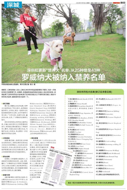南都讯 记者张艳丽 近日,记者从深圳市市场监督管理局了解到,为进一步做好深圳犬类管理工作,经调研,并借鉴其他城市规定与做法,结合深圳实际,该局起草了《深圳市烈性犬名单(修订征求意见稿)》(以下简称