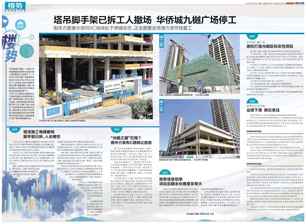 “昨天拆掉了最后一个吊塔,华侨城承接的光明中心区的九樾广场项目终于正式停工了。”11月4日,住在九樾广场项目附近的张生(化名)在社交平台上发布了上述消息,他告诉南都湾财社记者,据他观察,九樾广场项