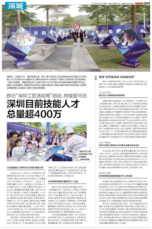 南都讯 记者张小玲 通讯员周沁薇 昨日,第三届深圳工匠活动周启动仪式暨2023年技能人才工作总结大会·最美手艺人展示活动在中心书城北广场举行。本届深圳工匠活动周以“弘扬工匠精神 技能创造未来”为主