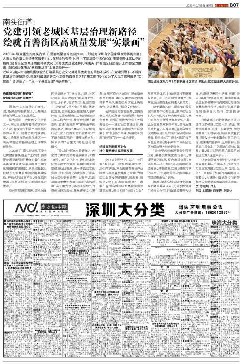 2023年,蝶变重生的南头古城,在游客纷至沓来的脚步中,一跃成为深圳首个国家级旅游休闲街区;人来人往的南头街道便民服务中心,在群众的夸赞中,挂上了深圳首个ISO9001质量管理体系认证的招牌;随着