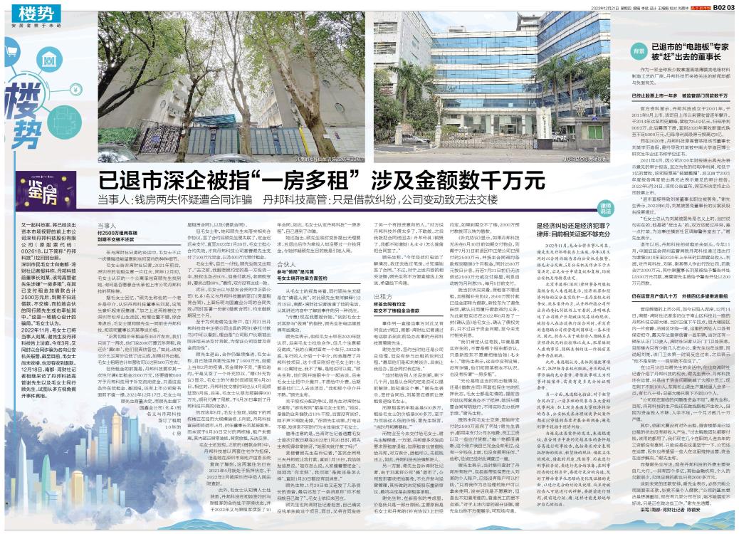 又一起纠纷案,将已经淡出资本市场视野的前上市公司深圳丹邦科技股份有限公司(原股票代码:002618,以下简称“丹邦科技”)拉回到台前。 深圳市民毛女士向南都·湾财社记者报料称,丹邦科技前董事长刘
