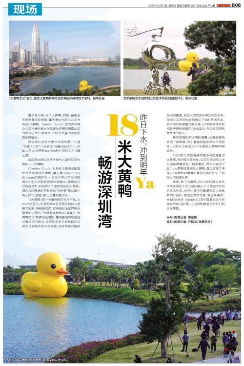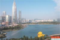 漫步深圳湾,打卡大黄鸭。昨日,由荷兰艺术家弗洛伦泰因·霍夫曼创作的公共艺术作品《大黄鸭 Rubber Duck》,作为深圳湾公共艺术季的展出作品在位于深圳市南山区的深圳人才公园亮相,并吸引大量的市