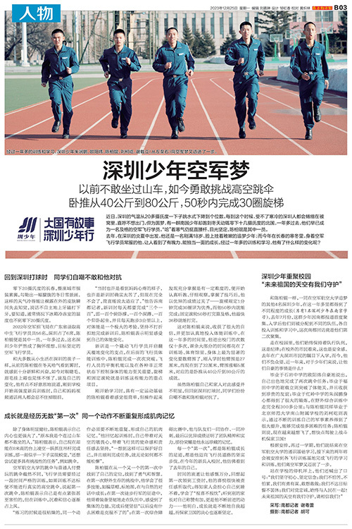 经过一年多的训练和学习,深圳少年朱润鹏、欧阳炜、陈柏锟、刘柯屹、谢载立(从左至右)向空军梦又迈进了一步。 近日,深圳的气温从20多摄氏度一下子跳水式下降到个位数。每到