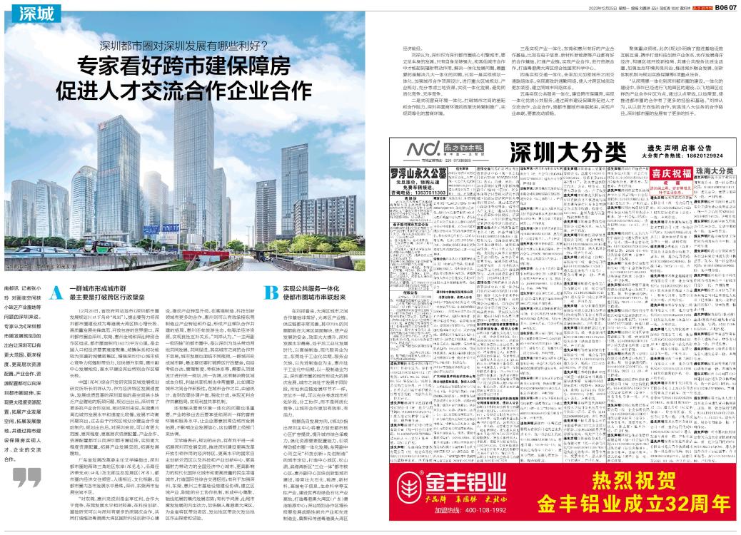 南都讯 记者张小玲 对面临空间狭小缺乏产业腹地等问题的深圳来说,专家认为《深圳都市圈发展规划》的出台让深圳可以有更大范围、更深程度、更高层次资源配置。产业合作、资源配置都可以向深圳都市圈延伸,实现