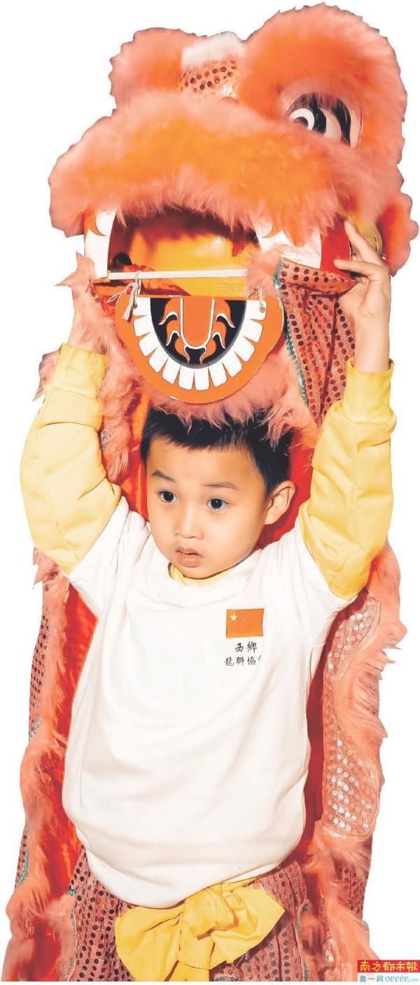 在今年西乡三月三庙会的醒狮展演中,一个叫冯镇宇的三岁“小幼狮”格外引人注目,这已经不是他第一次登台献艺,一岁半拎得起“小狮头”,两岁半开始舞狮,三岁开始表演,随手拿起鼓棒就能表演一段醒狮锣鼓,他参加了包括西乡“三月三”庙会等40余场大小活动……如今,小小年纪的镇宇,已收获了一大批粉丝。“我不喜欢玩其他的,就爱玩舞狮”,软软的声音,必须贴耳上去才听得清。但只要一拿起小狮头,一招一式就是一副高手的模样,这个小粉团子是醒狮团的“团宠”,在醒狮训练馆,其他的师兄们在训练的时候,他一个人就举着小狮头在一旁一板一眼地练习着醒狮特有的“喜、怒、醉、睡……”各种神态,鼓声一停下,有空的师兄就会过来纠正他的动作,一教一学中,传承开始聚合成型。“从我爷爷到我爸爸再到我和我弟弟,我们都喜欢舞狮也会舞狮,我希望他能够继续传承下去。”冯镇宇的爸爸王厚友感慨道,非遗那么有趣,如果连3岁的小孩都喜欢玩,那非遗就不会消失。
