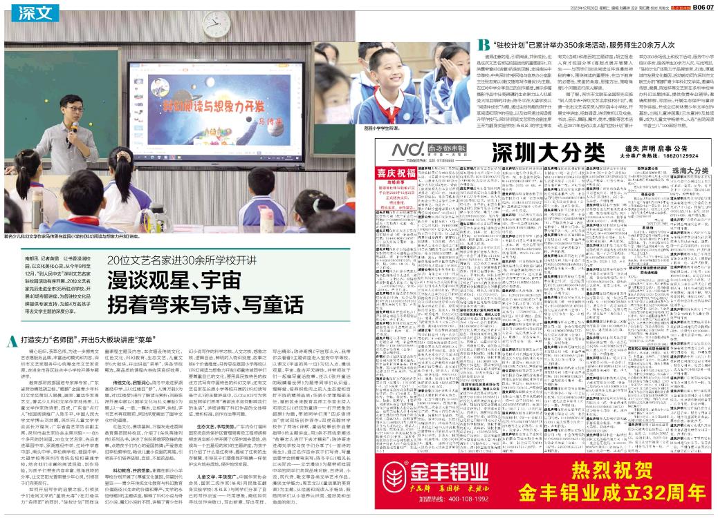 南都讯 记者黄璐 让书香浸润校园,以文化美化心灵。从今年9月至12月,“到人民中去”深圳文艺名家驻校园活动有序开展。20位文艺名家先后走进全市35所驻点学校,开展40场专题讲座,为各驻校文化品牌提