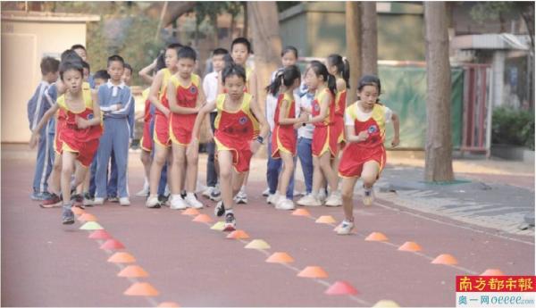 挖潜资源强化训练。挖潜资源落实体育训练。向南小学共有师生2100多人,但仅有一个不足200米跑道的运动场。在这样的条件下,向南小学合理利用有限空间,充分挖掘场地潜能,科学设计体育活动,充分保障了全体师生的体育运动需要,建立起晨练、大课间活动、“课后服务”三位一体的训练模式,分层次、分梯队进行学生体能训练,巩固体育基本技能,强化体育特长发展,把学生从繁重的作业负担中解放出来投身体育运动,享受体育乐趣、增强体质、健全人格、锤炼意志。学校虽然足球、排球场地简陋,但学校足球、排球成绩不俗;各项体育社团开展有声有色,田径项目成绩亮眼,其他项目多点开花。