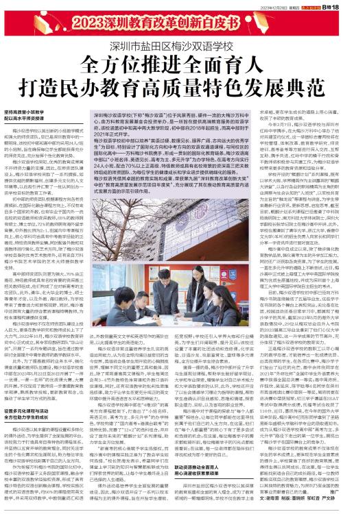 梅沙双语凭借其卓越的教育实践和成果,荣获第九届“深圳教育改革创新大奖”中的“教育高质量发展示范项目年度奖”,充分展现了其在推动教育高质量内涵式发展方面的示范引领作用。