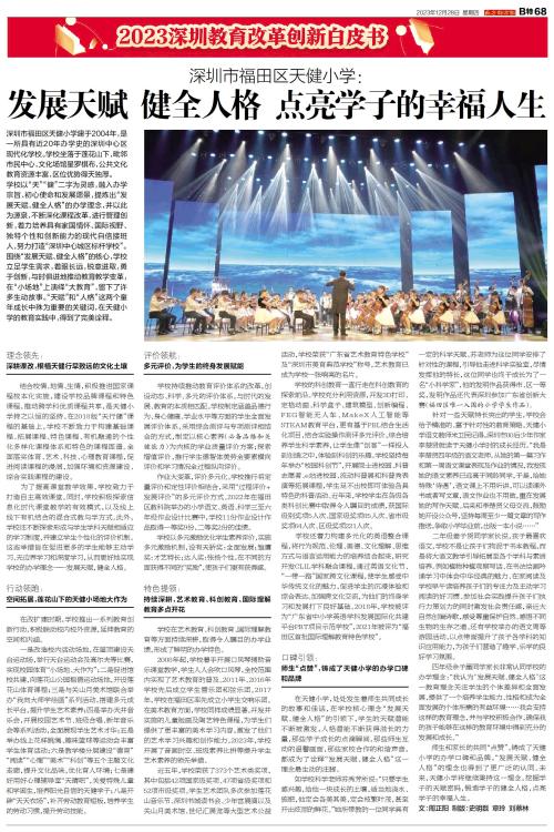 深圳市福田区天健小学建于2004年,是一所具有近20年办学史的深圳中心区现代化学校。学校坐落于莲花山下,毗邻市民中心,文化场馆星罗棋布,公共文化教育资源丰富,区位优势得天独厚。 学校以“天”“健