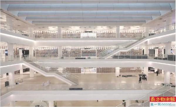 站在5楼往下看,每层楼都呈“回”字形,馆内各个功能区、座位区也尽收眼底。抬头看,呈卷轴形状的天花板,其弧形的折射角度让阳光变得格外柔和,外墙鱼鳞的设计在阳光照耀下发出斑斓的波光,让阅读多了一份浪漫。