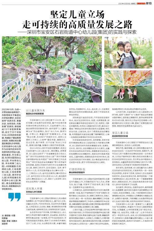 2023年10月,为进一步贯彻落实省教育厅、市教育局关于集团化办学相关要求,宝安区按照“优质示范、尊重历史、协同创优、均衡发展”的原则,新组建成15个学前教育集团,设立了20个非独立法人机构的创优