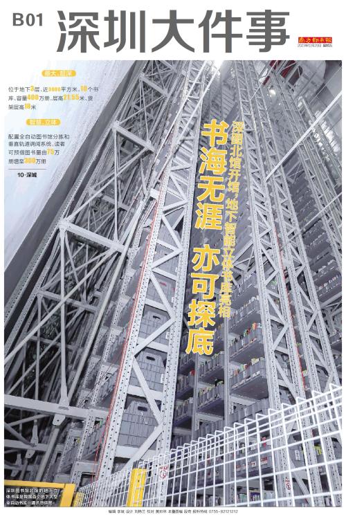 最大、超深 位于地下3层、近3000平方米、10个书库、容量400万册,层高21.55米、货架层高18米 智慧、立体 配置全自动图书馆分拣和垂直轨道调阅系统,读者可预借图书量由75