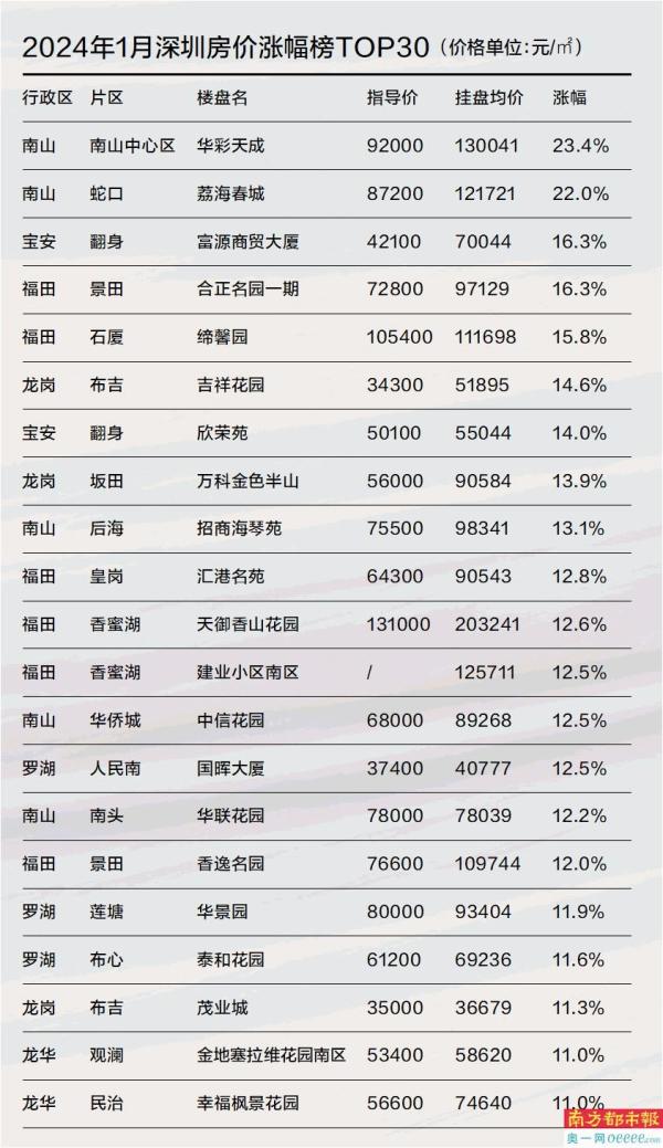 那么深圳哪些小区的房价是在真实上涨的呢?深圳2024年初最新房价数据显示,2024年初有5个小区的挂牌均价涨幅超过15%,有超30个小区的挂牌均价涨幅超过10%。