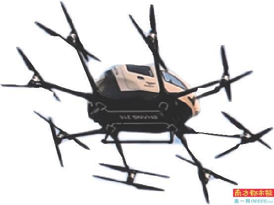 1. 在深圳市盐田区的东部通航运行基地,一台亿航载人级自动驾驶飞行器与一架贝尔206直升机在同一空域中试飞。