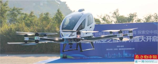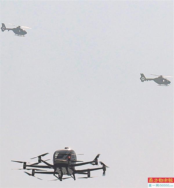 EH216-S型无人驾驶载人飞行器与两架来自东部通航的直升机一同起飞。