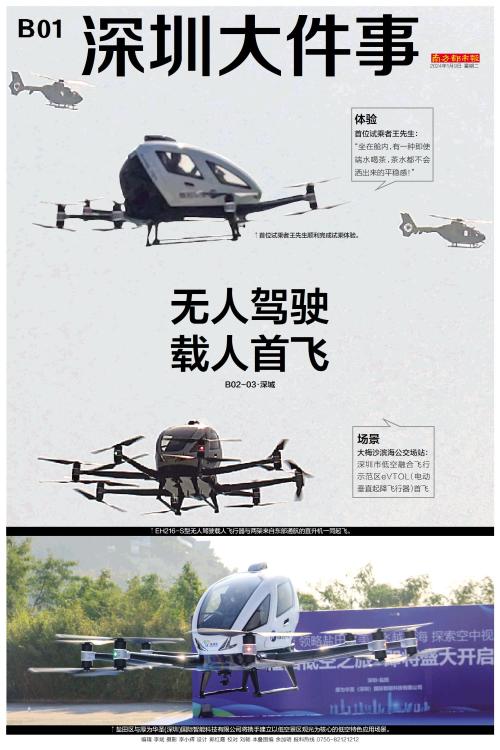 体验 首位试乘者王先生: “坐在舱内,有一种即使端水喝茶,茶水都不会洒出来的平稳感!” 场景 大梅沙滨海公交场站: 深圳市低空融合飞行示范区eVTOL(电动垂直起降飞行器)首飞 B02