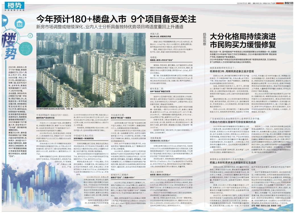 2023年,深圳共入市了178个新盘,新增供应面积579.2万㎡,同比上升27.6%;供应56909套,同比上升21.9%。供应量为近八年第二高,仅次于2021年。去年年内,新房住宅存量突破517