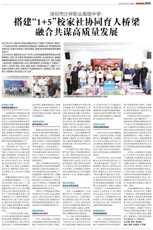 2023年12月,深圳市沙井职业高级中学(以下简称“沙井职高”)凭借“1+5”校家社协同育人桥梁的突出发展成效,荣获第九届“深圳教育改革创新论坛”校家社协同育人学校年度奖,持续为职业教育高质量发展