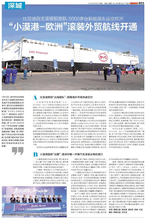 1月15日,深圳市深汕特别合作区小漠国际物流港比亚迪汽车滚装船首航仪式举行,超5000台新能源汽车搭乘比亚迪首条滚装运输船“EXPLORER NO.1”,驶向欧洲,实现了小漠港滚装外贸运输直达欧洲