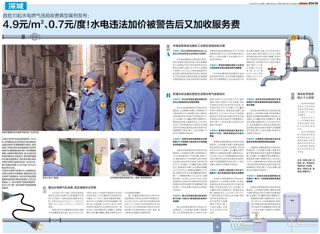 记者从深圳市市场监管局获悉,2023年,该局推动出台《深圳经济特区居民生活用水电燃气价格管理若干规定》,联合多部门印发《深圳市加强居民生活用水电燃气价格管理实施方案》,并开展摸底调查,全面抓好整改