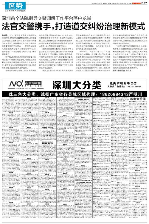 南都讯 近日,深圳市龙岗区人民法院与深圳市公安局交通警察局龙岗大队签署《关于道路交通事故纠纷多元化解机制合作框架协议》,并揭牌成立全市首个法院指导交警调解的工作平台——深圳市龙岗区人民法院龙岗交警