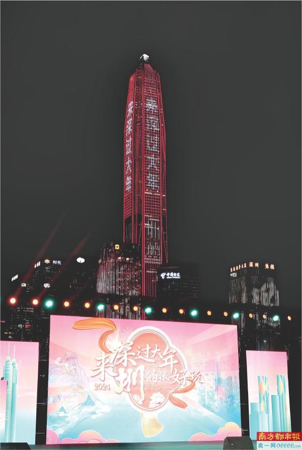 1月21日晚,“来深过大年 圳的很好玩”2024深圳新春文旅嘉年华启动仪式在市民中心举行。平安金融中心大厦也亮灯滚动播放相关宣传语。 南都记者 赵炎雄 摄