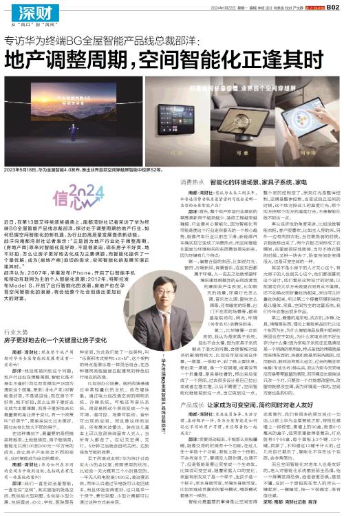 近日,在第13届艾特奖颁奖盛典上,南都湾财社记者采访了华为终端BG全屋智能产品线总裁邵洋,探讨处于调整周期的地产行业,如何把握空间智能化的新机遇,为行业的高质量发展提供新动能。 邵洋向南都湾财社