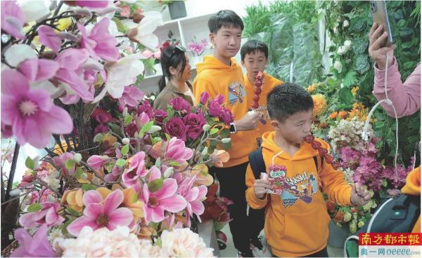 在南山花卉世界,小“砂糖橘”参观花店,他们每人获得了一串冰糖葫芦。